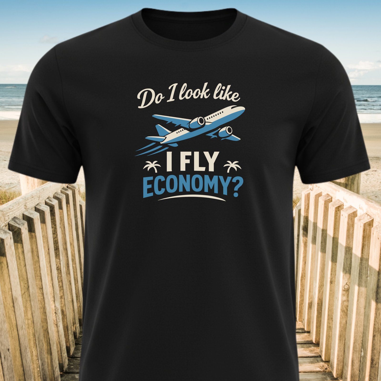 Show your love for luxury travel with this funny “Do I Look Like I Fly Economy” design. This design features an airplane and palm trees, perfect for your next vacation.