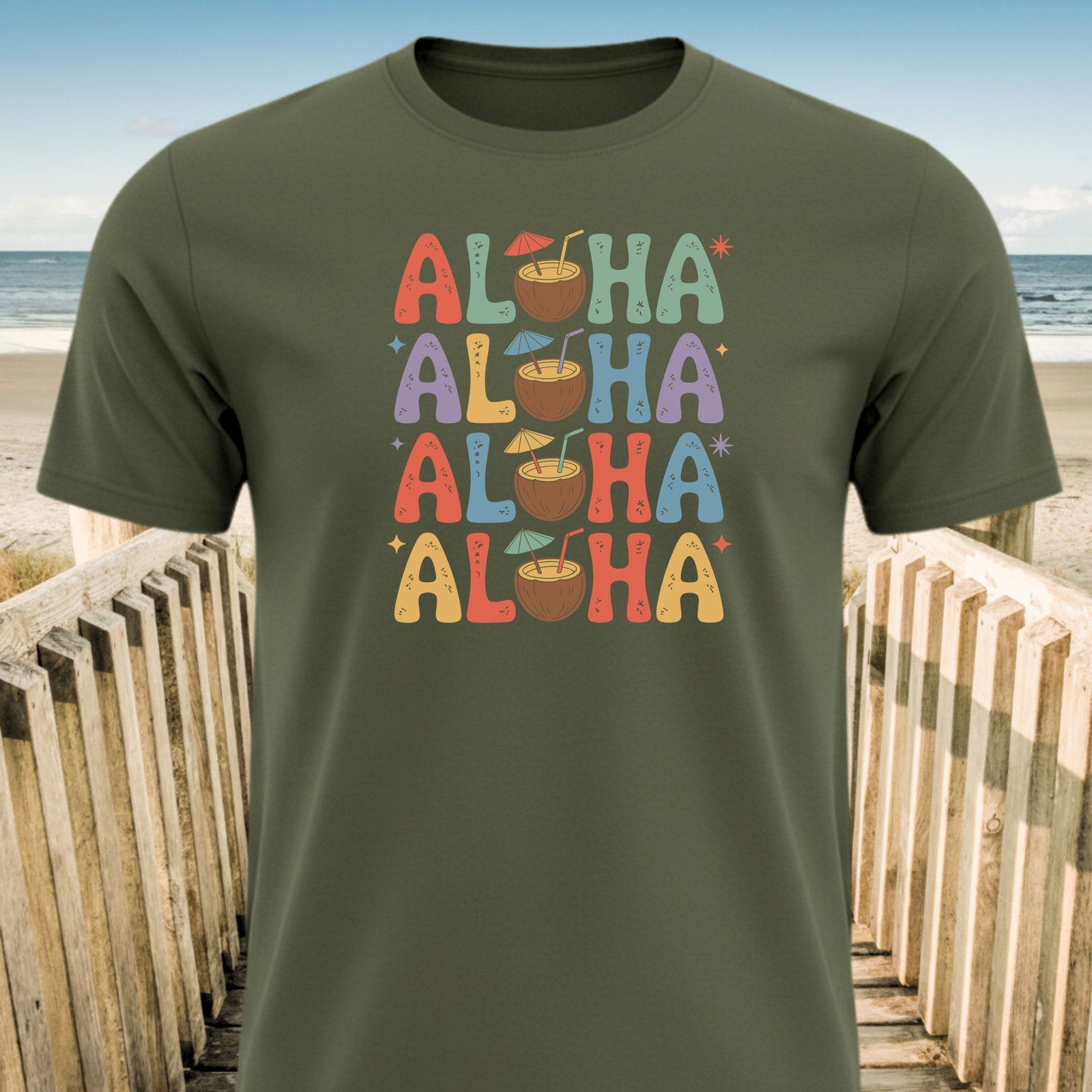 Get ready for your next vacation with this Aloha T-Shirt! This T-Shirt features a fun Aloha design with a refreshing coconut drink. Perfect for summer adventures and island vibes.