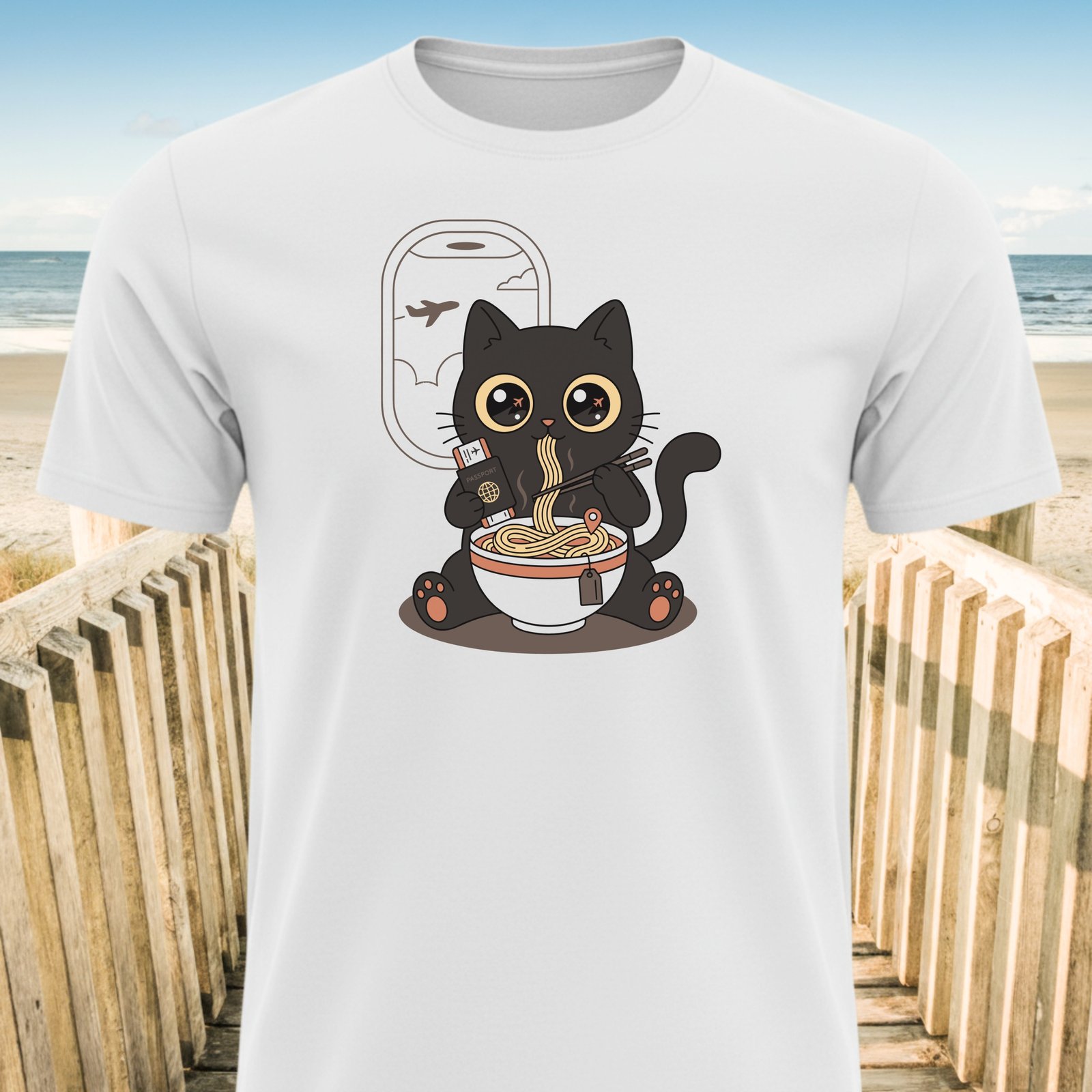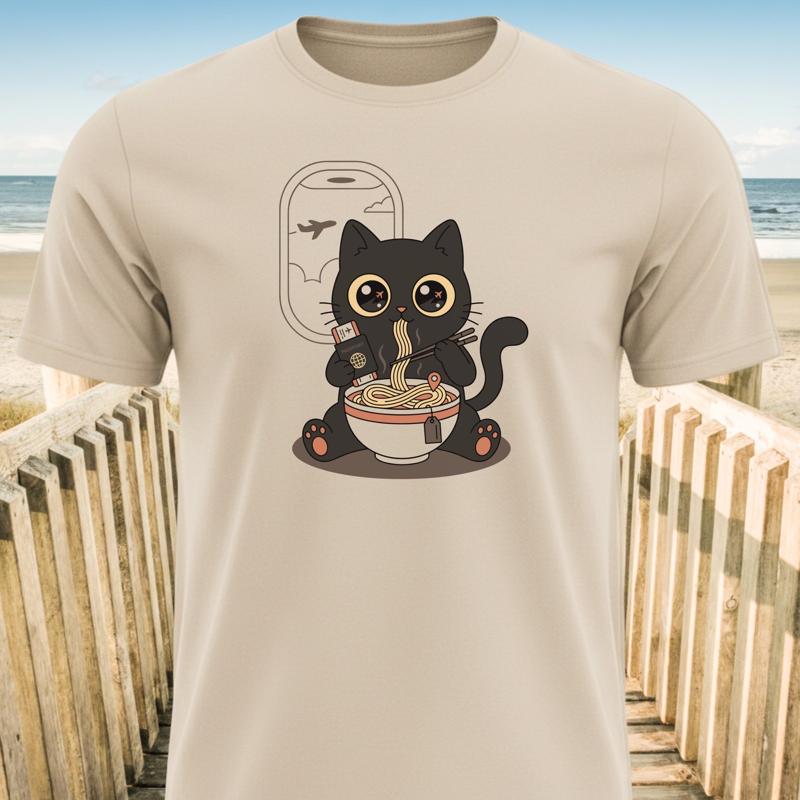 Embrace wanderlust with this adorable black cat enjoying ramen mid-flight. This design captures a heartwarming blend of travel dreams and cozy comfort.