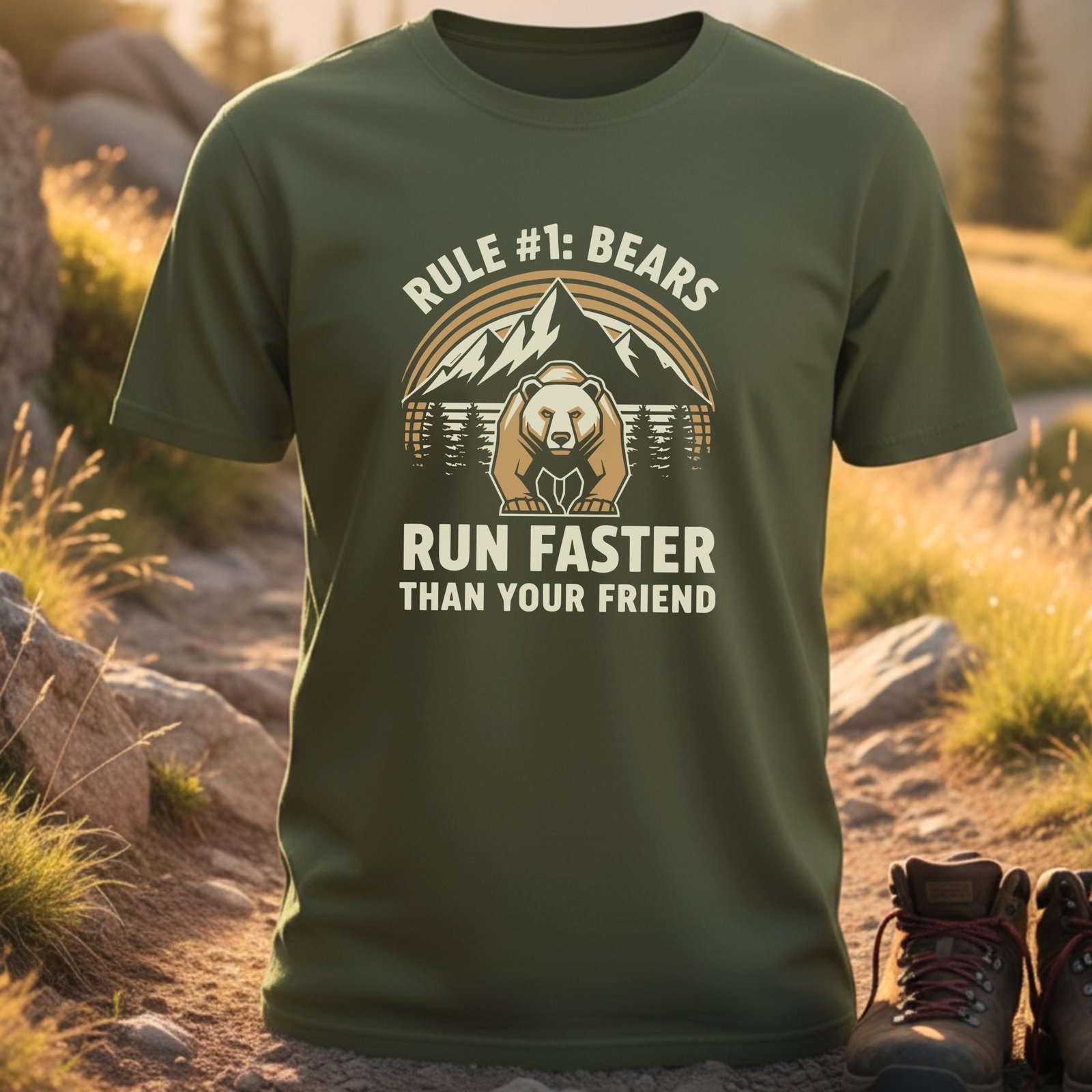 Embrace the outdoors with this funny bear design. Perfect for camping trips or hiking adventures. The “Rule #1: Bears Run Faster Than Your Friend” slogan is humorous and unique.