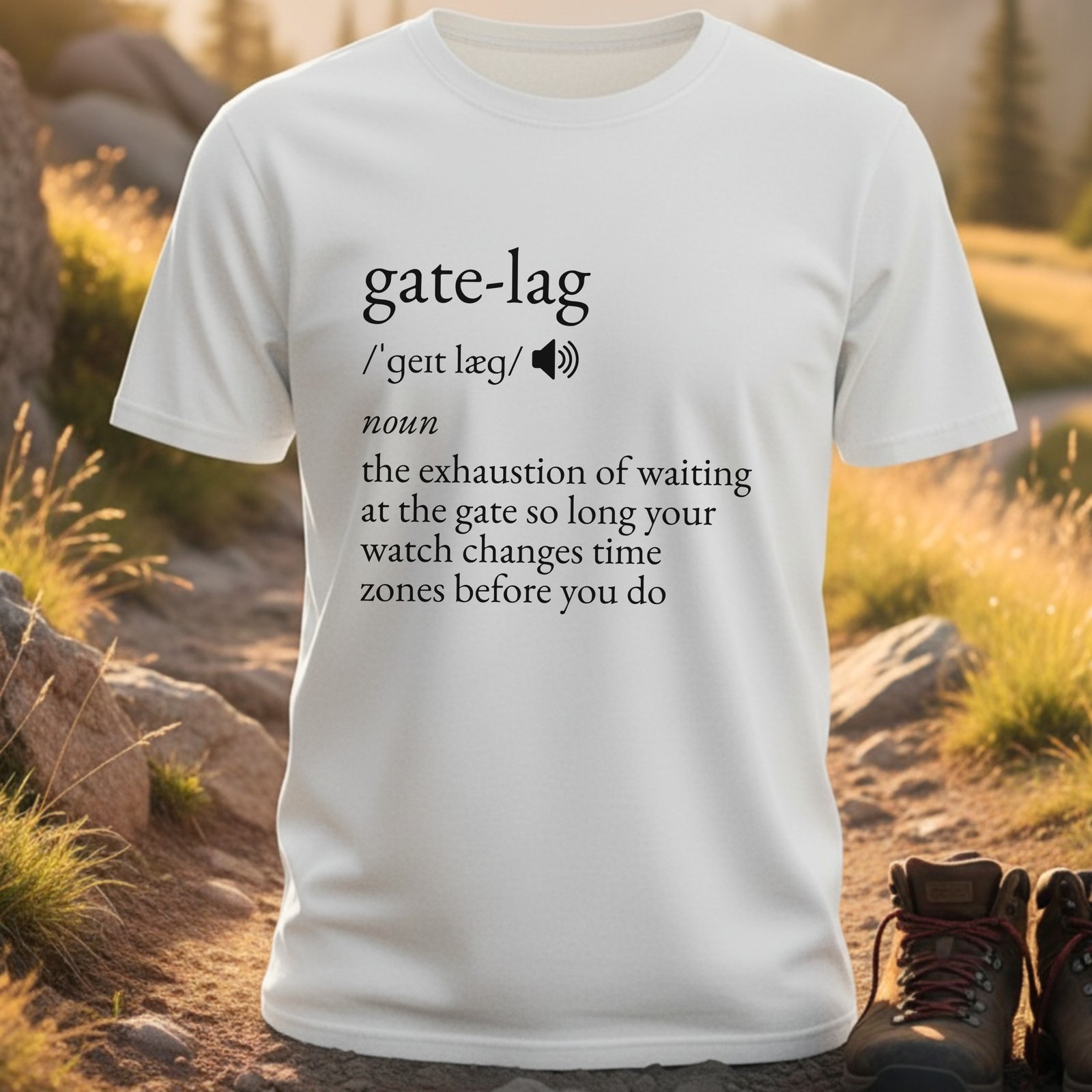 Experience travel humor with this witty “gate-lag” definition T-shirt! It is for travel lovers who understand the exhaustion of long airport waits. It is the perfect gift.