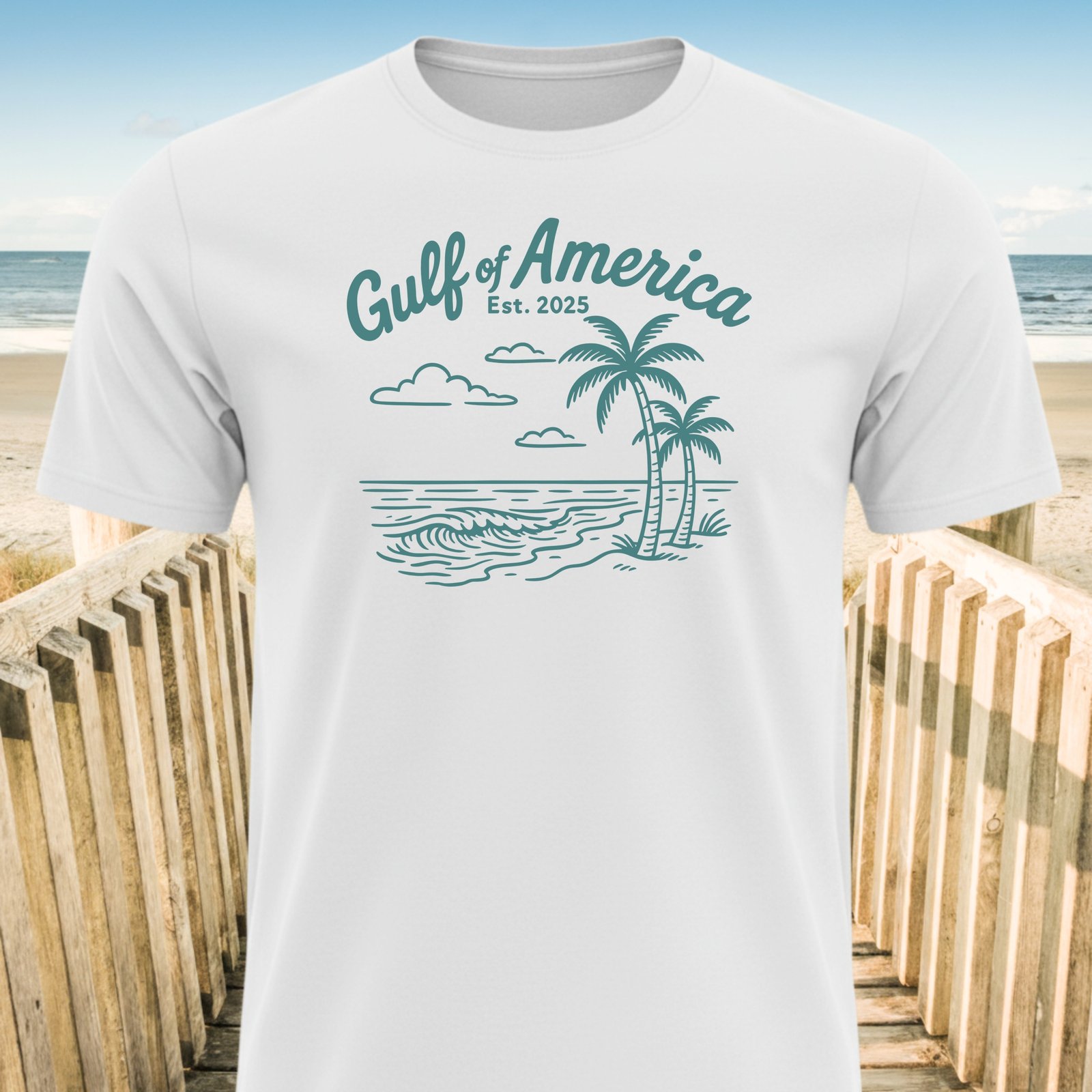 Experience the beauty of Gulf of America with this eye-catching T-shirt. Featuring palm trees waves and a modern design it’s perfect for travel and vacation lovers! Get yours today.