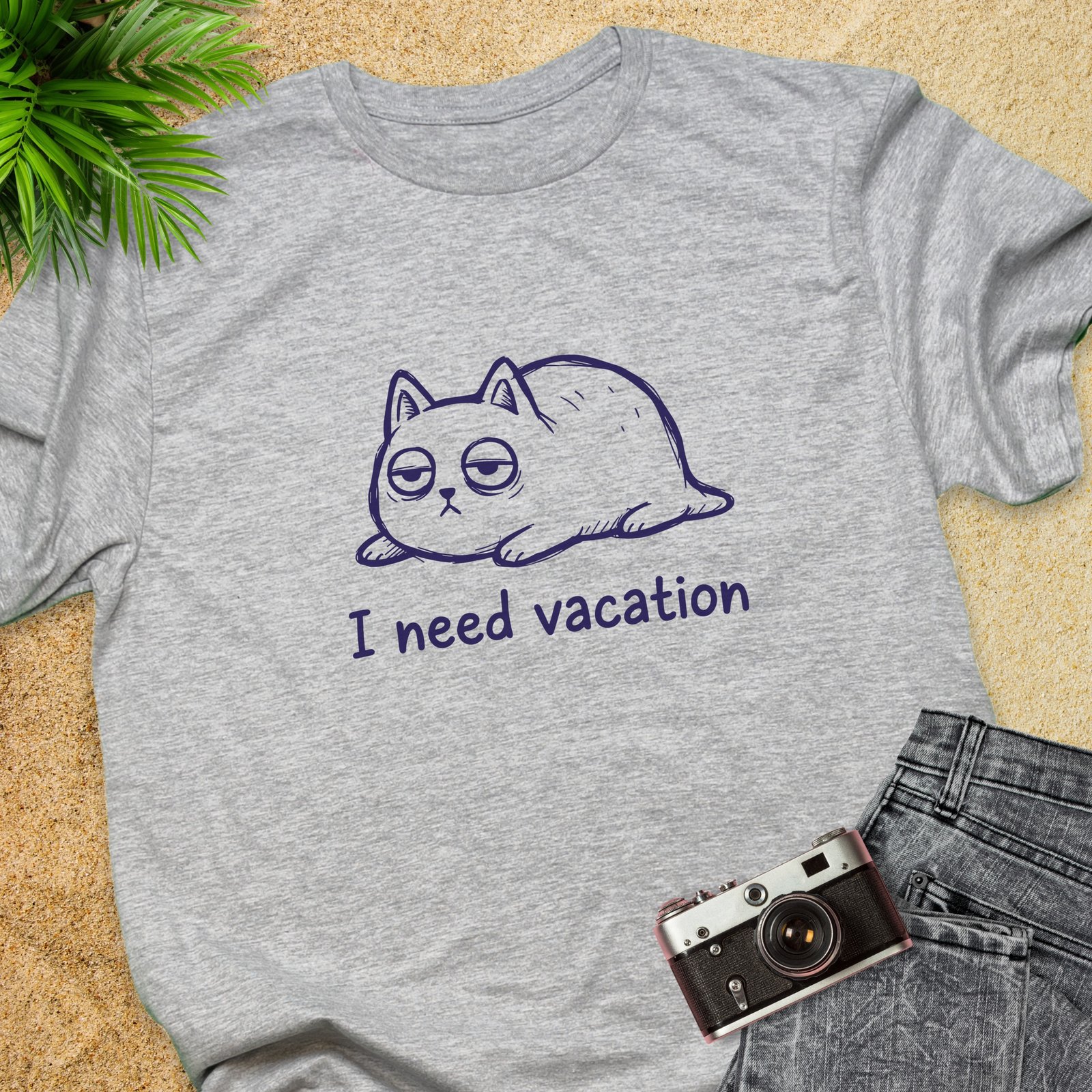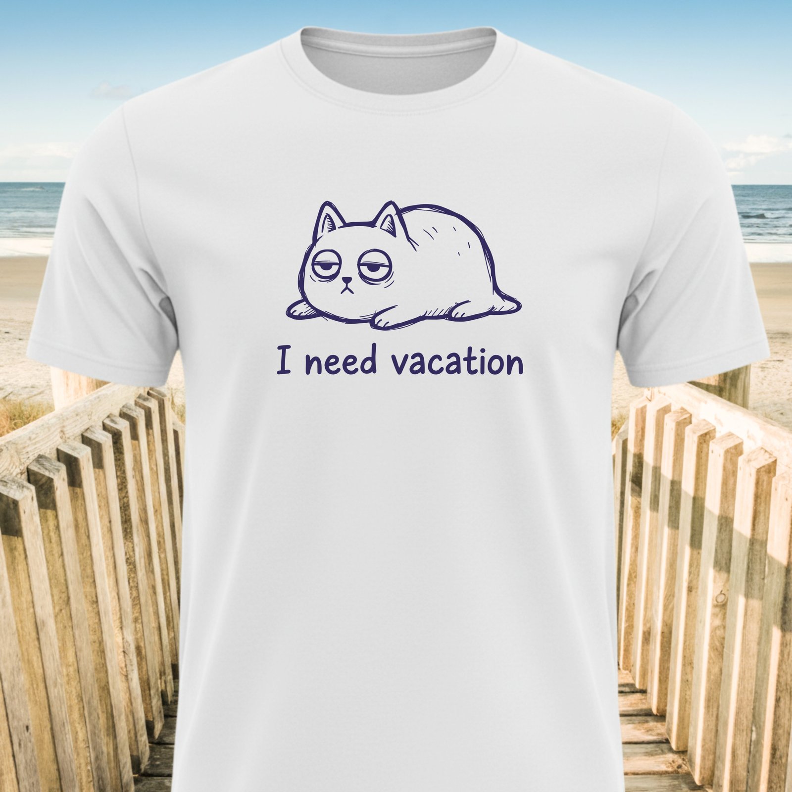 Show off your mood with our “I Need Vacation” T-shirt! Features a grumpy cat perfect for expressing exhaustion or the need for a getaway. Get yours now and chill.