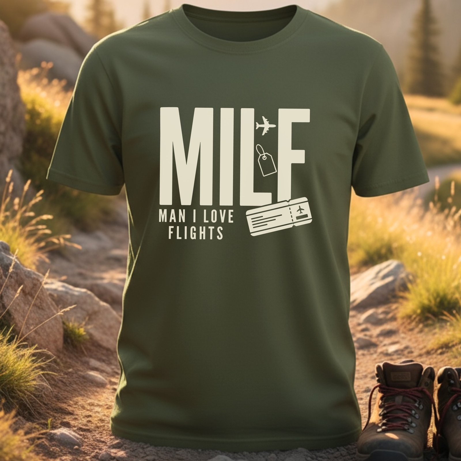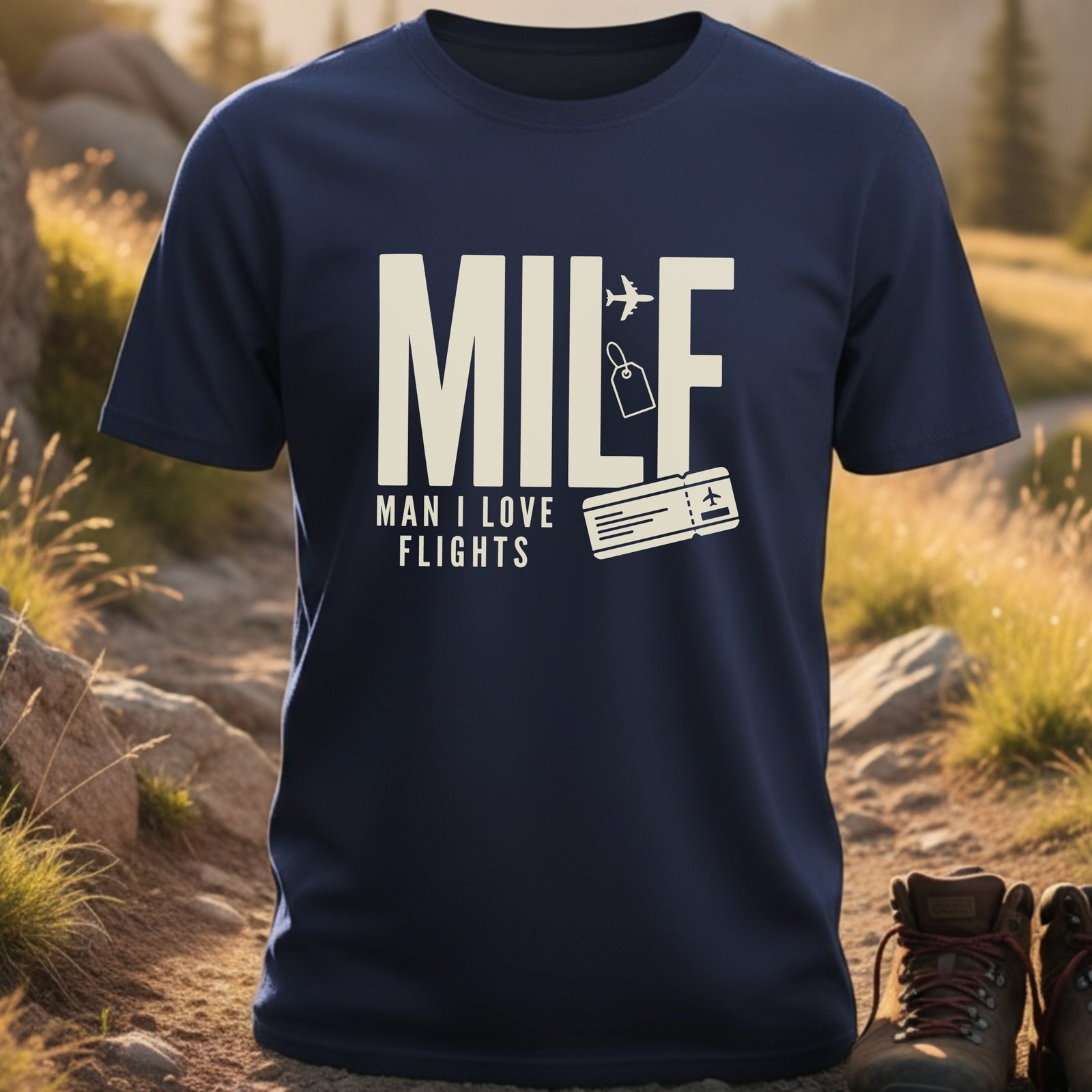 Embrace your love for flying with this clever ‘Man I Love Flights’ MILF design. This witty shirt is perfect for aviation enthusiasts. Express your passion for travel and spark smiles everywhere.