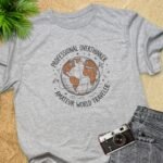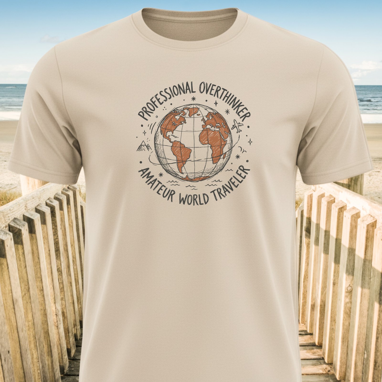 Some of us are destined to chart courses across continents in our minds long before our feet ever hit the ground. This exclusive T-shirt captures the essence of that delightful contradiction: the ‘Professional Overthinker’ who is also an ‘Amateur World Traveler.’ Featuring a beautifully sketched globe surrounded by whimsical elements like an airplane and mountains, this design speaks to the soul of every thoughtful adventurer.