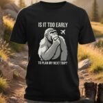 This design features a thoughtful gorilla pondering travel plans and adventure. It captures the anticipation and excitement for future journeys.