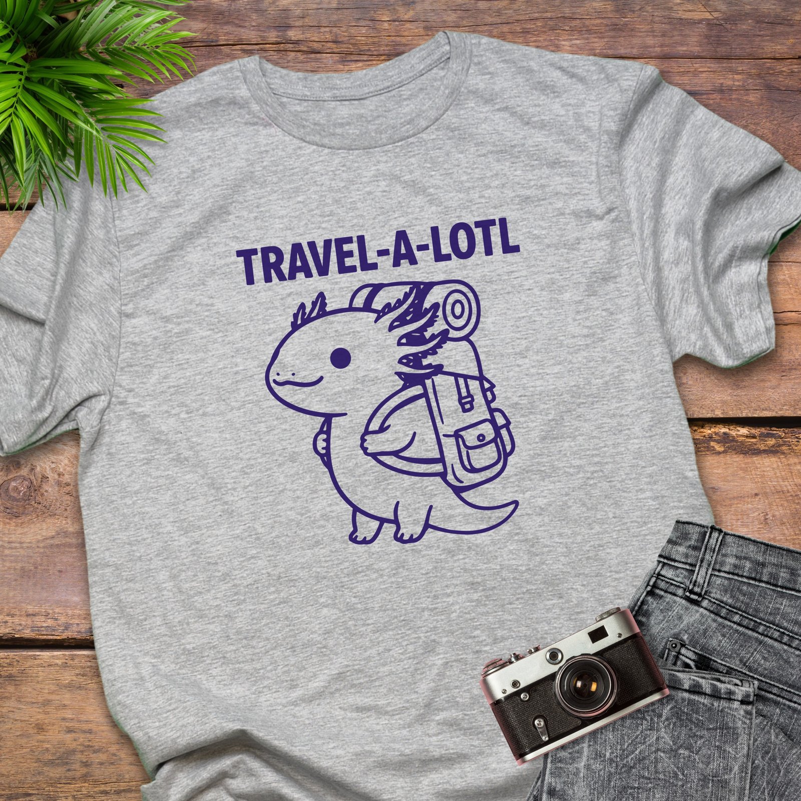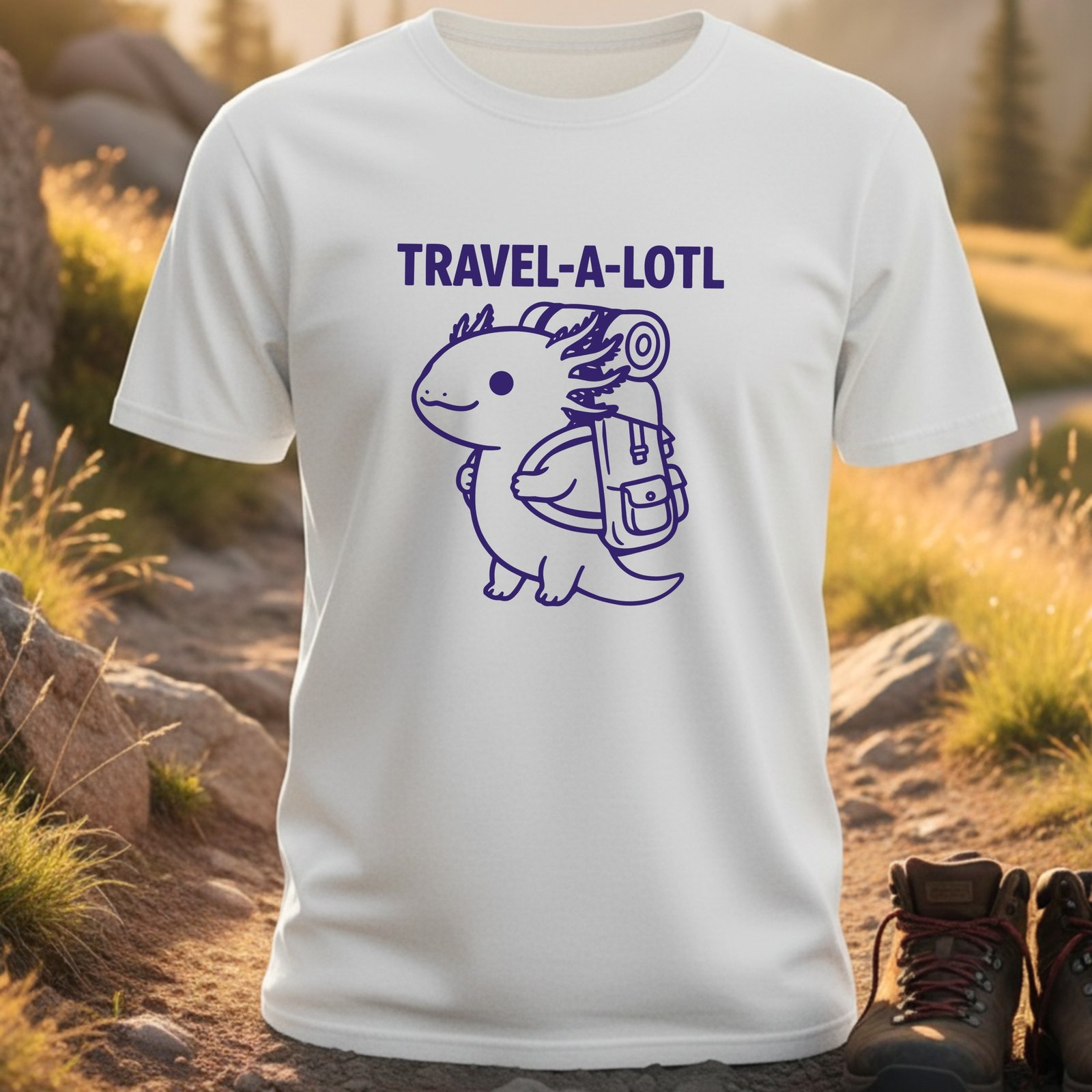 This charming T-shirt features an adorable axolotl ready for adventure! With a backpack and a “TRAVEL-A-LOTL” slogan it captures the spirit of exploration, perfect vacation.