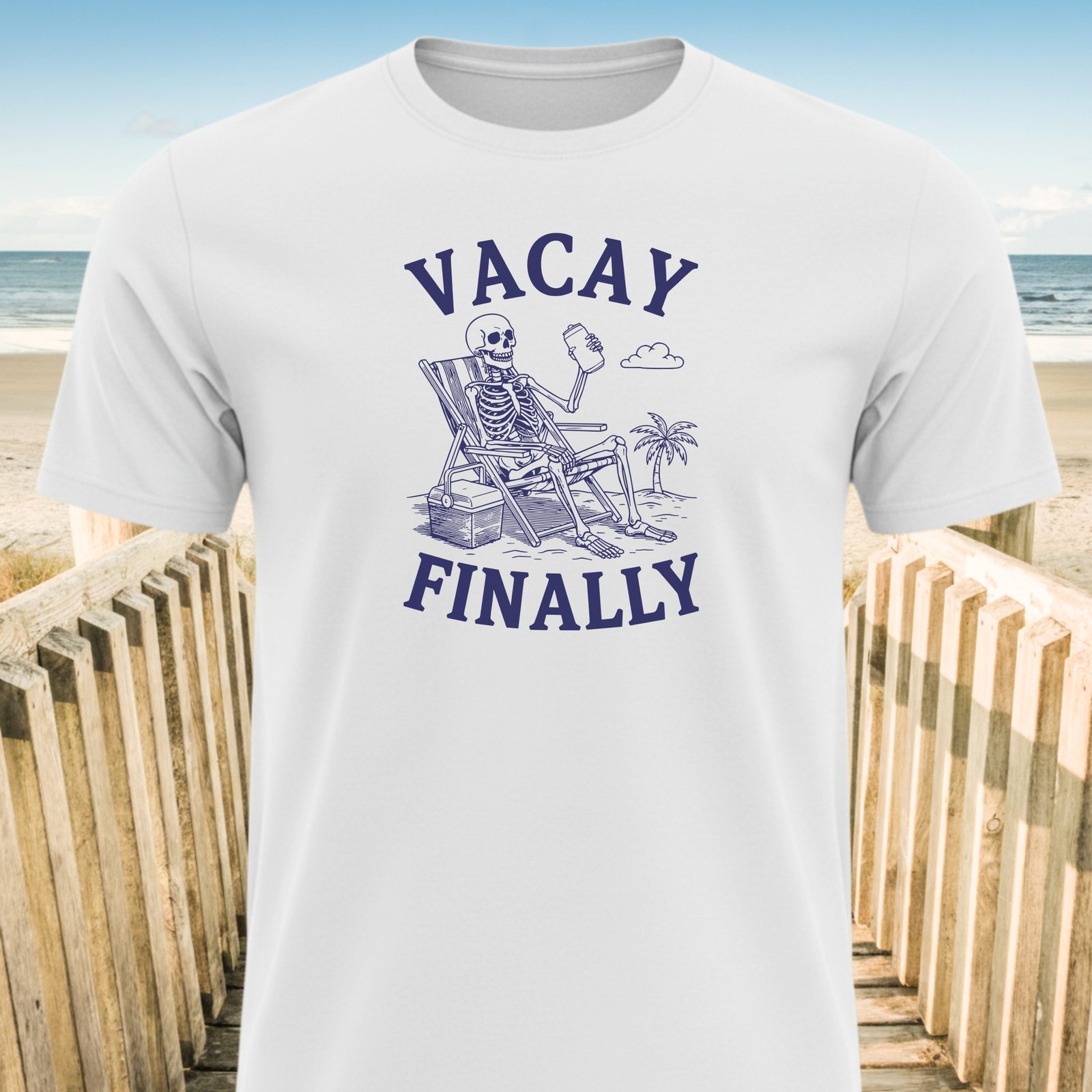 Get ready for your much-needed vacation with this Vacay Finally T-shirt. The design features a skeleton relaxing on a beach with a drink in hand. It’s time to unwind.