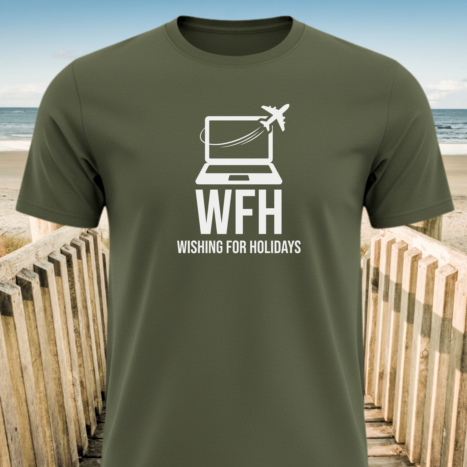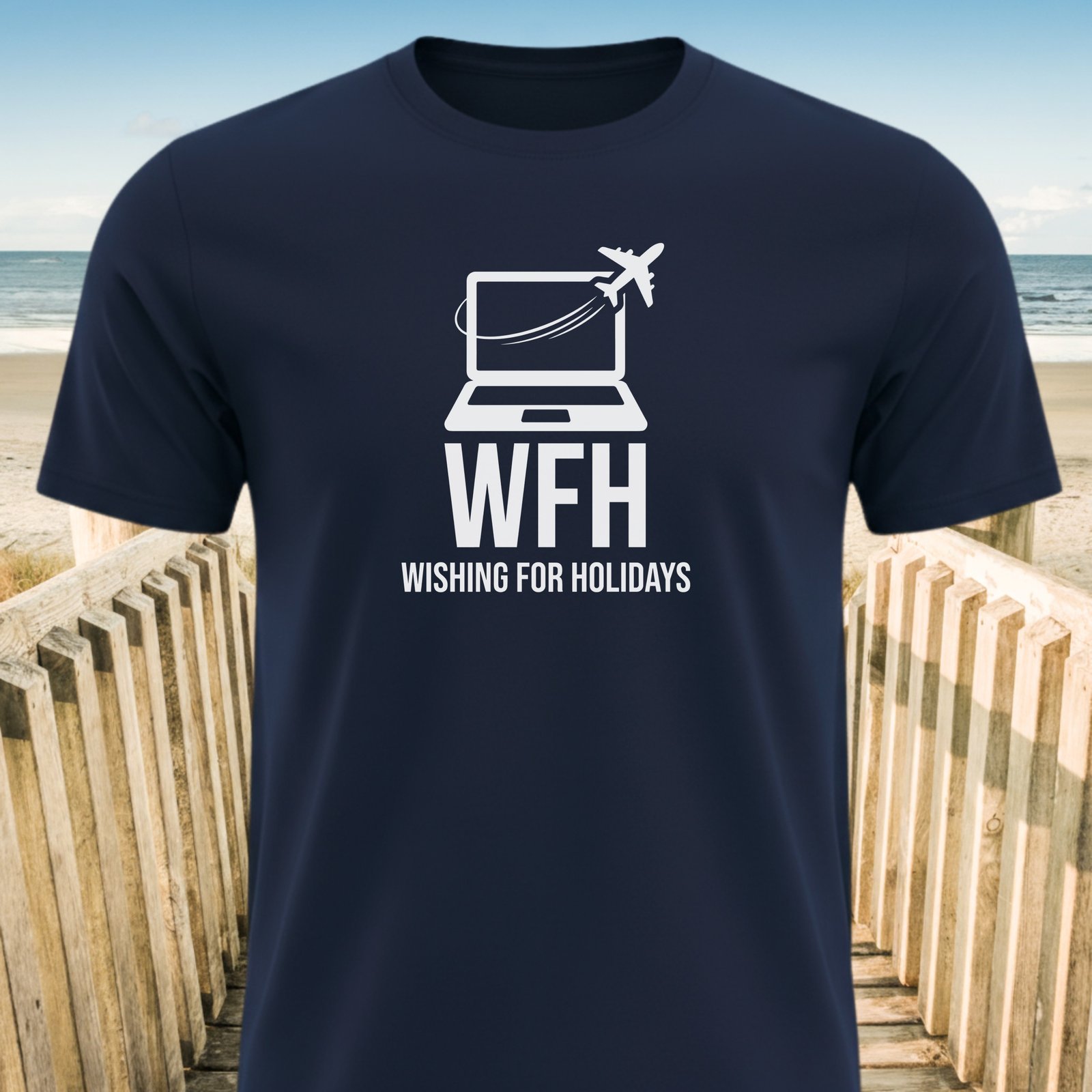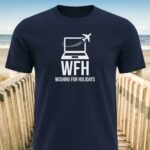 Dive into the relatable struggle of working from home while your mind is miles away on a sunny beach or mountain retreat. This unique “WFH Wishing for Holidays” T-shirt isn’t just clothing; it’s a statement for every remote professional dreaming of their next adventure. Its clever design features a laptop with an airplane taking flight, symbolizing the ultimate work-life balance fantasy we all share.